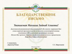 «Дагестанский региональный социальный фонд “Все вместе” выражает Вам слова искренней признательности за оказание гуманитарной помощи участникам СВО и активную гражданскую позицию. Желаем Вам крепкого здоровья, профессиональных успехов и процветания. Мира Вам, добра и благополучия!»
